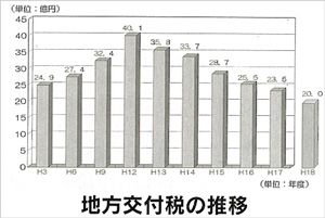 - 今回は削減される一方の地方交付税について質問する。平成18年度の地方交付税の額が確定し、初めて20憶円を下回った。咋年度比14%もの減ということであるが、ただでさえ厳しい本町の財政状況の中、今回の減額はかなりのものだ。私が議員とならせていただいた平成13年度と比べると現在17億円ほどの驚くべき額が減額をされている。政府の三位一体の改革の影響であると思うが、大きな減額の理由は。